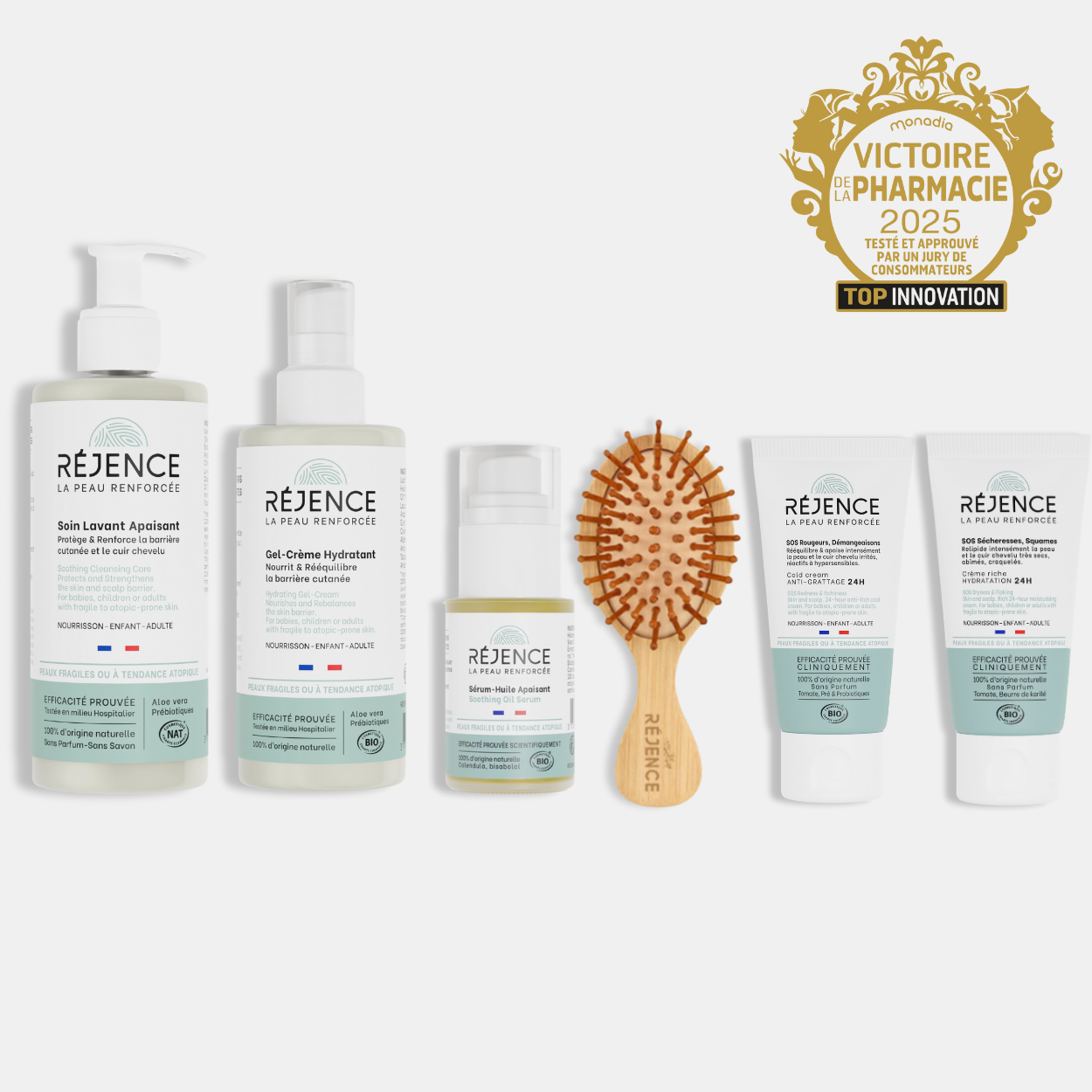 Chez Réjence, nous avons établi une No-List stricte pour garantir une sécurité maximale, particulièrement pour les peaux sensibles et atopiques, ainsi que pour les bébés, dont la barrière cutanée est encore immature. Nos produits sont formulés 100 % sans pétrochimie, sans silicones ni huile minérale, qui créent un film occlusif à la surface de la peau, l'étouffant et empêchant une bonne respiration cutanée.