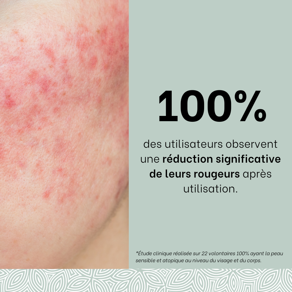 🔬TESTS CLINIQUES : Hydratation 24H. -24,1% de rougeurs après 3 jours consécutifs d'application. 100% ont une diminution des rougeurs cutanées. 100% ont une barrière restaurée. 100% ont la peau immédiatement plus confortable.