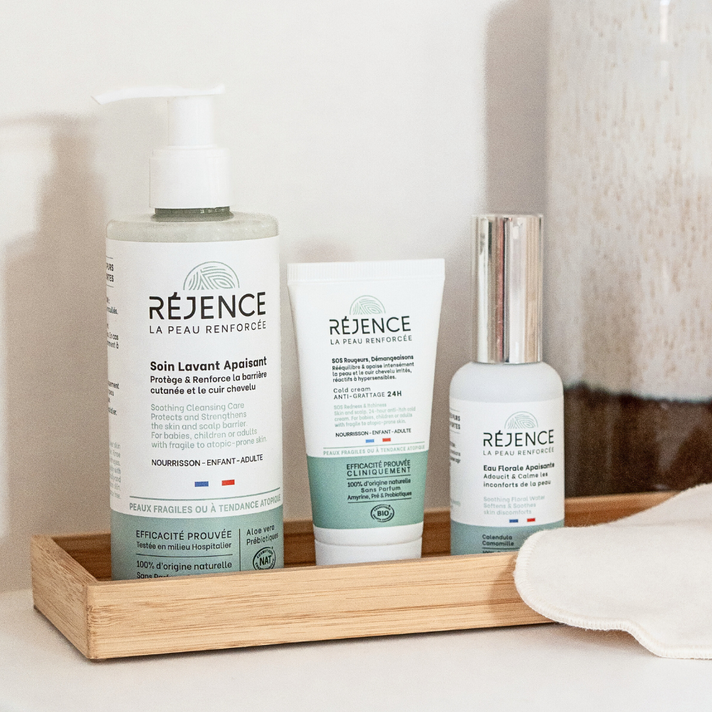 Chez Réjence, nous avons établi une No-List stricte pour garantir une sécurité maximale, particulièrement pour les peaux sensibles et atopiques, ainsi que pour les bébés, dont la barrière cutanée est encore immature. Nos produits sont formulés 100 % sans pétrochimie, sans silicones ni huile minérale, qui créent un film occlusif à la surface de la peau, l'étouffant et empêchant une bonne respiration cutanée.