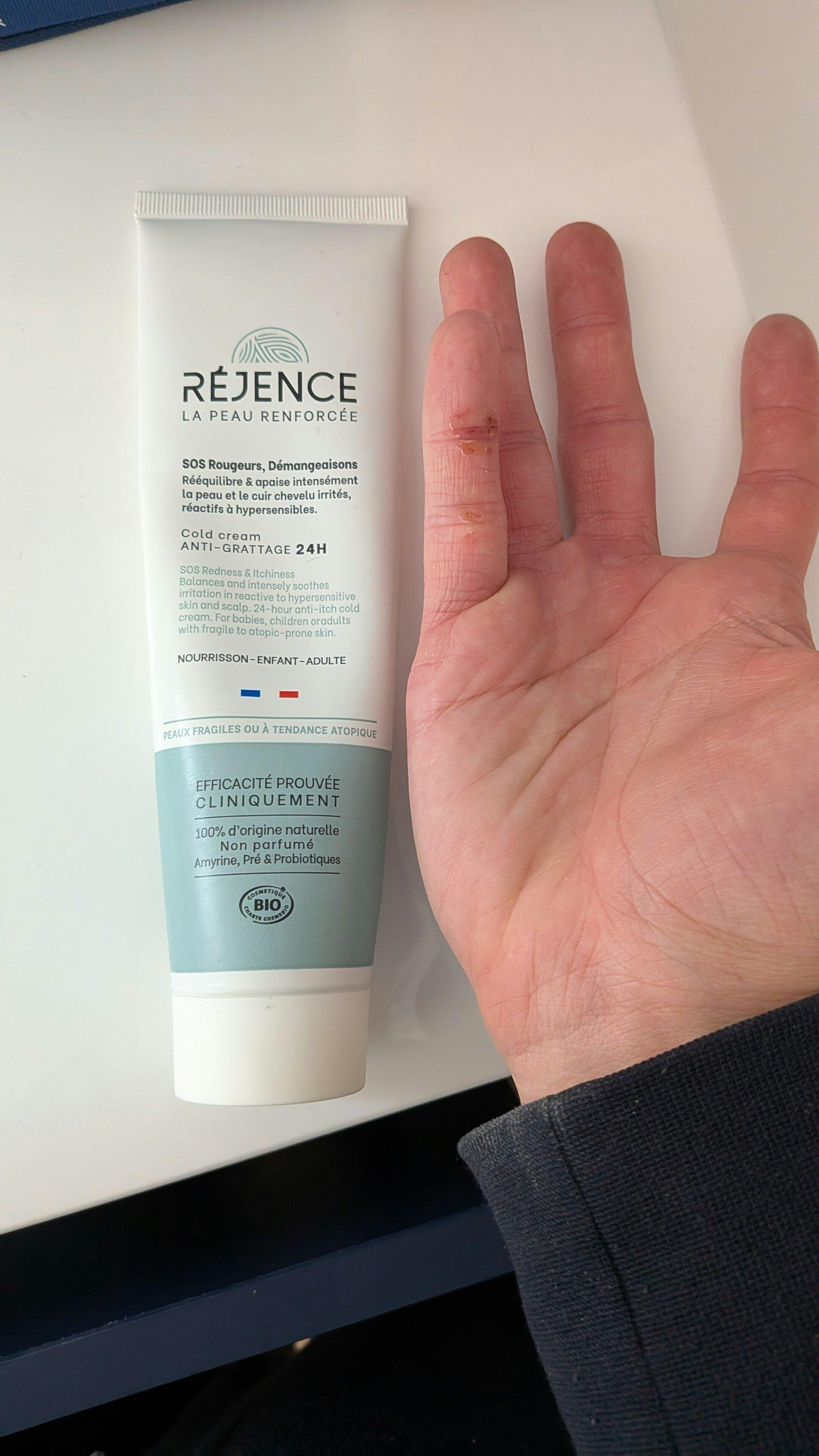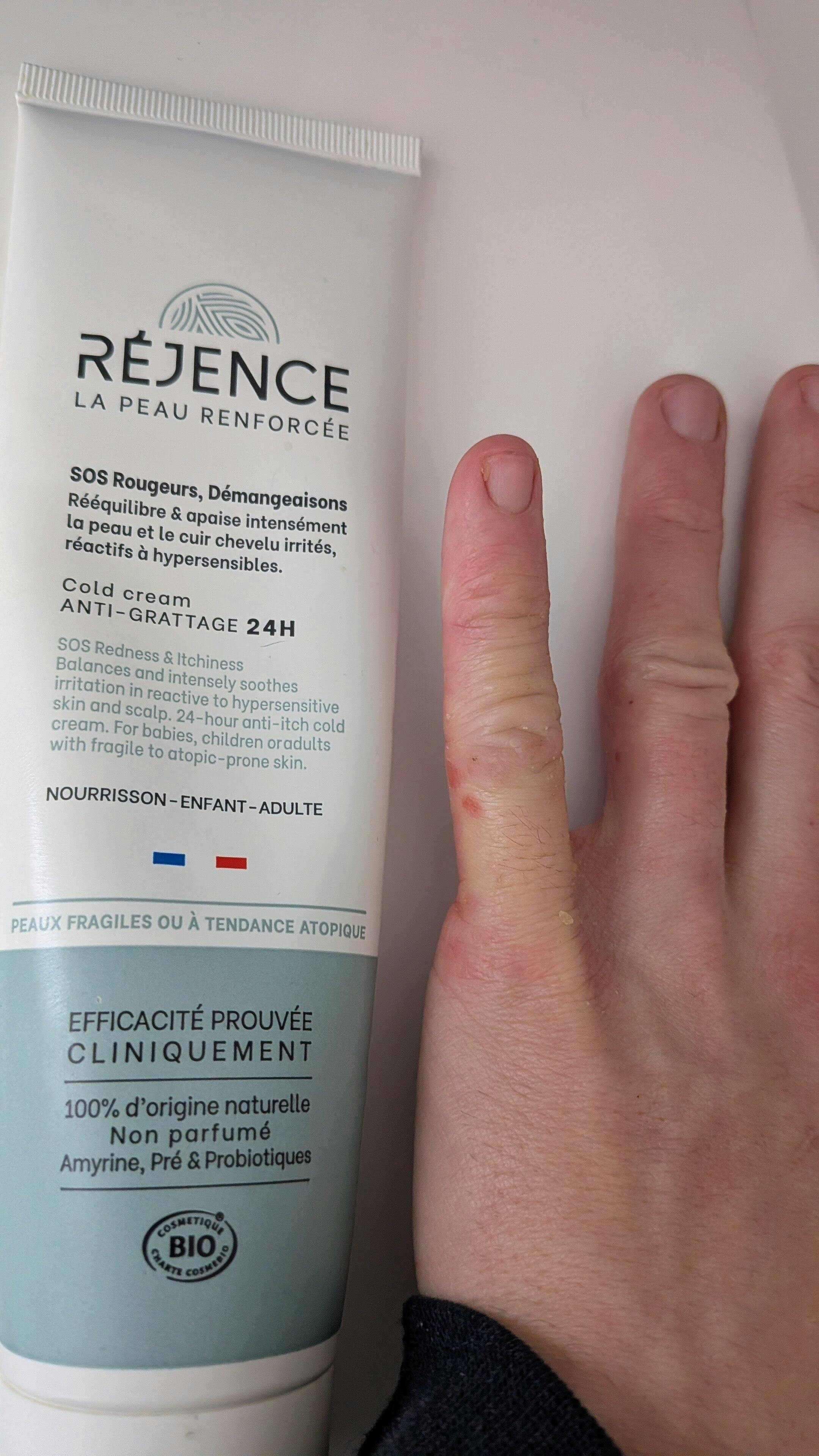 La crème anti grattage de Réjence soulage les démangeaisons de mon eczéma (persistant) des mains dès les 15 premières minutes d'applications.
