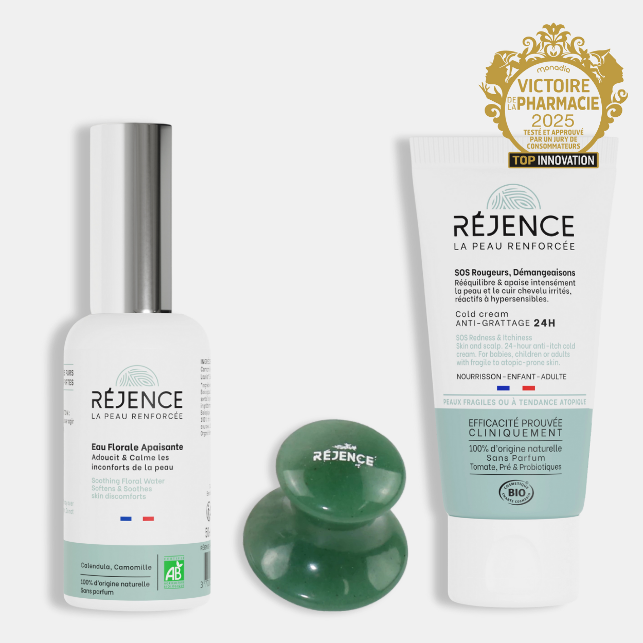 Trois essentiels pour offrir un soulagement immédiat et durable aux démangeaisons et grattages obsessionnels : l’eau florale apaisante, la crème SOS démangeaisons et la pierre anti-grattage.