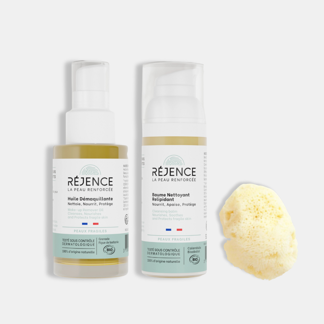 Cette routine se compose de l'Huile Démaquillante, du Baume Nettoyant Relipidant et de l'Éponge Naturelle.